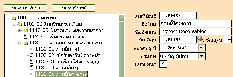 ขั้นตอนที่ 2 การเตรียมผังบัญชี กำหนดที่ เมนูบัญชี ข้อ 2 ผังบัญชี จะต้องสร้างผังบัญชีที่จะใช้เกี่ยวกับโครงการโดยให้กำหนดตรงบรรทัด "แยกแผนก" เป็น Y (ดูรูปที่ 2 ประกอบ)เช่น