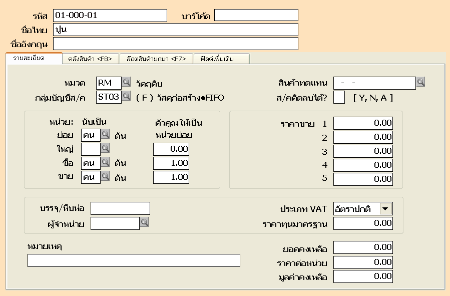 ขั้นตอนที่ 6 เตรียมข้อมูลวัตถุดิบกำหนดกลุ่มบัญชีวัตถุดิบที่ เมนูเริ่มระบบ ข้อ 1. กำหนดค่าเริ่มต้นต่าง ๆ ข้อ3. ระบบสินค้าคงเหลือ 2. กลุ่มบัญชีสินค้า และกำหนดที่ เมนูสินค้า ข้อ 2 รายละเอียดสินค้า