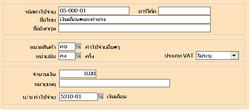 ขั้นตอนที่ 8 เตรียมข้อมูลค่าใช้จ่ายที่ เมนูซื้อ ข้อ 7 รายละเอียดค่าใช้จ่ายโดยกำหนดรหัสค่าใช้จ่ายทั้งหมดที่ต้องนำมาใช้ในการบันทึกรายการ เช่นเงินเดือนและค่าแรง,ค่าเบี้ยเลี้ยง