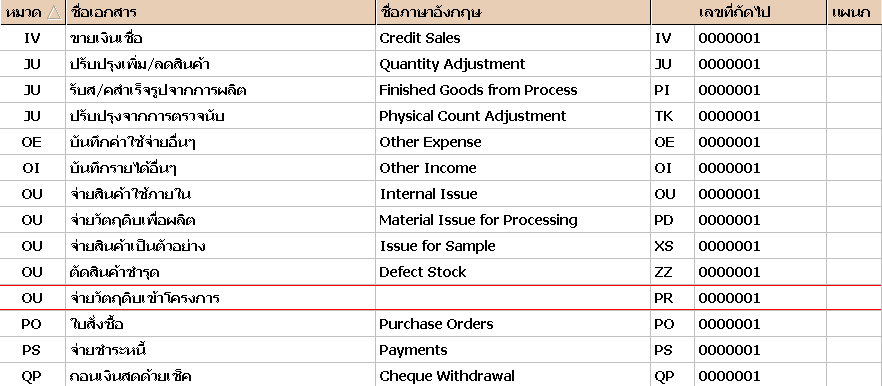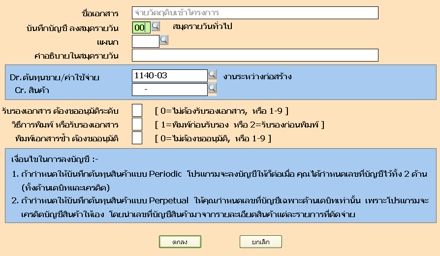 ขั้นตอนที่ 9 สร้างเอกสารที่จำเป็นต้องใช้เพิ่มเติม กำหนดที่ เมนูเริ่มระบบ ข้อ 4 กำหนดเลขที่เอกสาร โดยให้คัดลอกจาก หมวด OU " จ่ายวัตถุดิบเข้าโครงการ" และกำหนด เลขที่บัญชีด้าน Dr.เป็น งานระหว่างก่อสร้าง