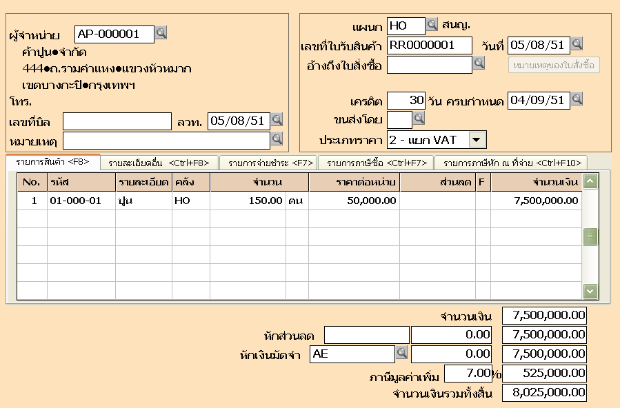 ขั้นตอนที่ 4 เตรียมข้อมูลเจ้าหนี้ กำหนดที่ เมนูซื้อ ข้อ 6 รายละเอียดผู้จำหน่าย