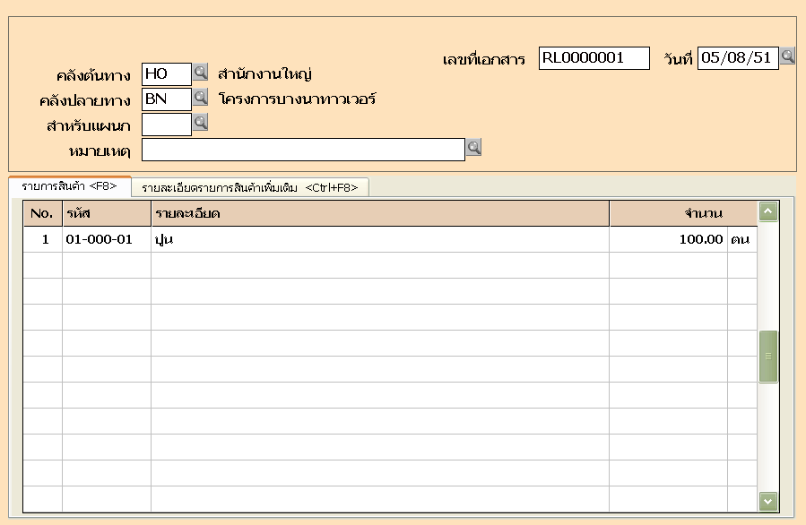 2. โอนย้ายวัตถุดิบจากคลังสำนักงานใหญ่ เข้าโครงการก่อสร้างที่บางนาทาวเวอร์ โดยบันทึกที่ เมนูสินค้า ข้อ 1 รายการประจำวันสินค้า / ข้อ 2 โอนย้ายระหว่างคลัง เพื่อให้สามารถตรวจสอบได้ว่ามีวัตถุดิบคงเหลือในแต่ละโครงการเท่าใด รวมทั้งปริมาณวัตถุดิบคงเหลือในสำนักงานใหญ่