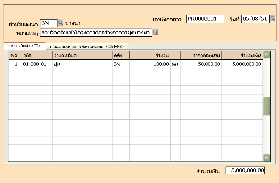 หมายเหตุ คุณอาจจะระบุคลังที่จะรับวัตถุดิบเข้า เป็นคลังของโครงการก่อสร้างนั้น ๆ เลยก็ได้