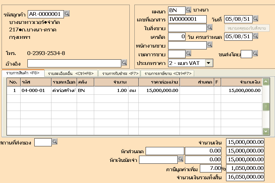 6. บันทึกขายเชื่อ เพื่อเรียกเก็บเงินค่าก่อสร้างตามสัญญาที่ เมนูขาย ข้อ 4 ขายเงินเชื่อ