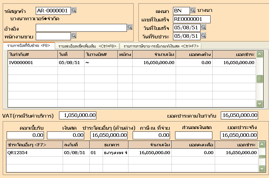 7. บันทึกรับชำระหนี้ที่ เมนูการเงิน ข้อ 1 รับเงิน / ข้อ 5 รับชำระหนี้